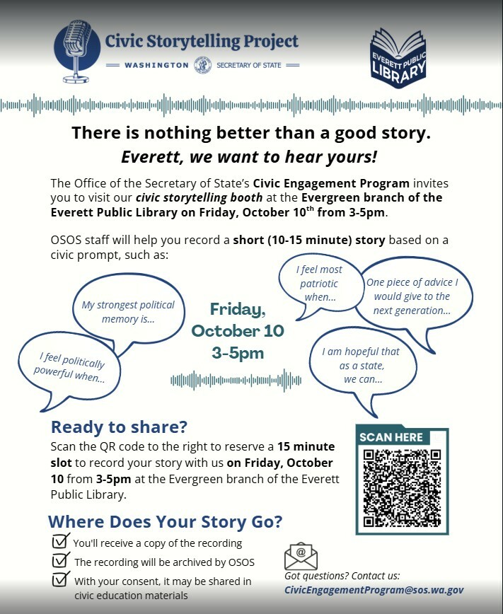 The Office of the Secretary of State’s Civic Engagement Program (hosted by Michael Bowman) invites you to visit our Civic Storytelling Booth at the Evergreen Branch! After a brief presentation, staff will help you record a short (10-15 minute) story based on a civic prompt, such as, “I am politically powerful when . . . .” After you finish your recording, you’ll receive a copy, and the recording will be archived. With your consent, it may be shared in civic education materials. Sign up here.