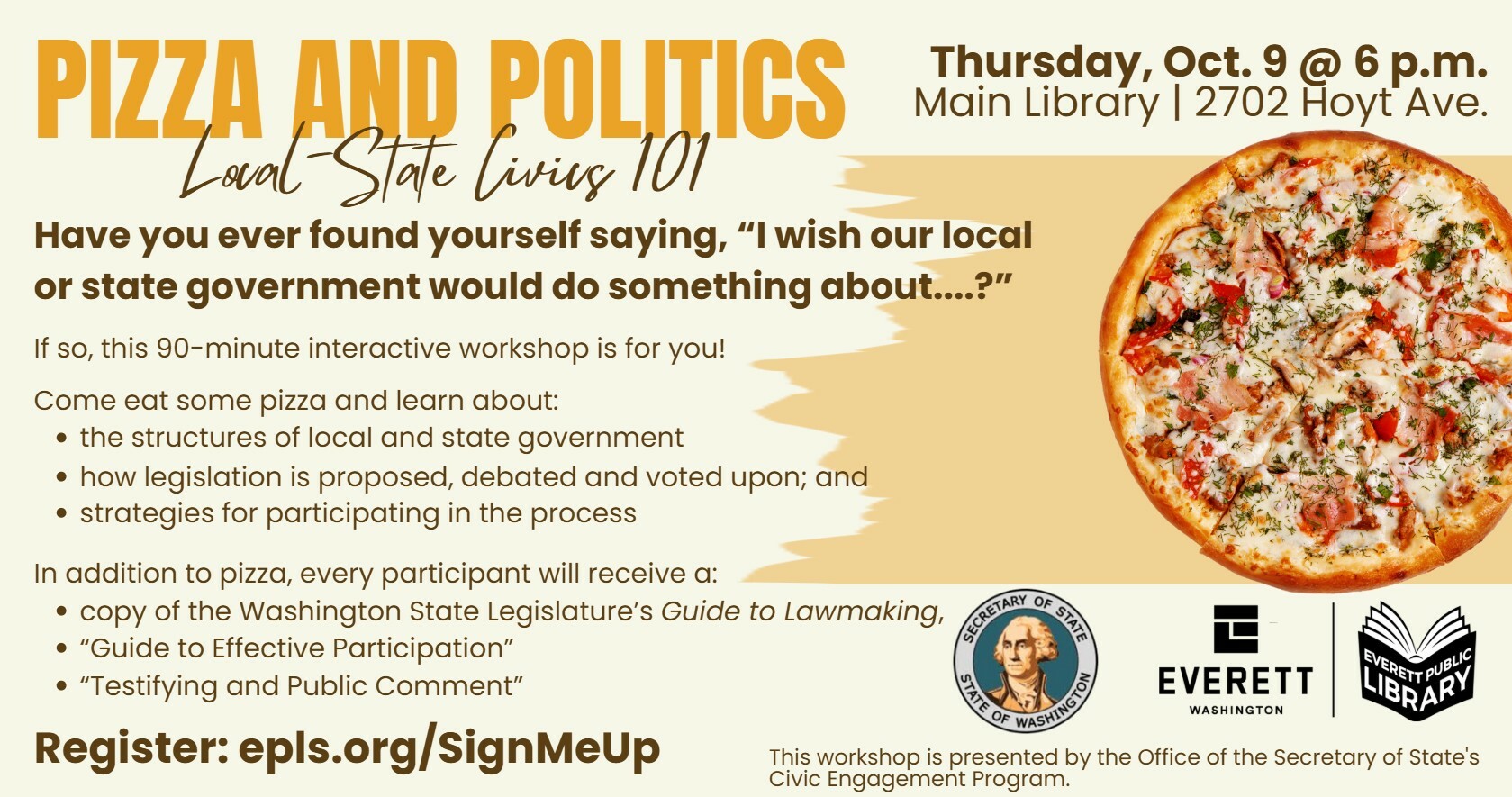 This is a 90-minute workshop, sponsored by the Office of the Washington Secretary of State Civic Engagement Program (hosted by Michael Bowman), on the structure of local and state government, policy proposals, debates, and voting, as well as strategies for participation in the local, county, and state legislative process. In addition to free pizza, attendees will receive a copy of “Washington State Legislature’s Guide to Lawmaking,” “Guide to Effective Participation,” and the “Legislative Tracker.” Submit a civics question to Michael when you sign-up here! Registration is optional.
