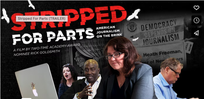 Stripped for Parts describes how hedge funds took control of many legacy newspapers, sold off assets — including their buildings — and made severe cuts to newsrooms. In the past 20 years, 2,000 newspapers have closed across the U.S., creating news deserts and decimating the local news ecosystem. The documentary was created by two-time Academy Award-nominated Producer/Director Rick Goldsmith. It showcases how the motive to make a profit deters efforts to save and rebuild local journalism.