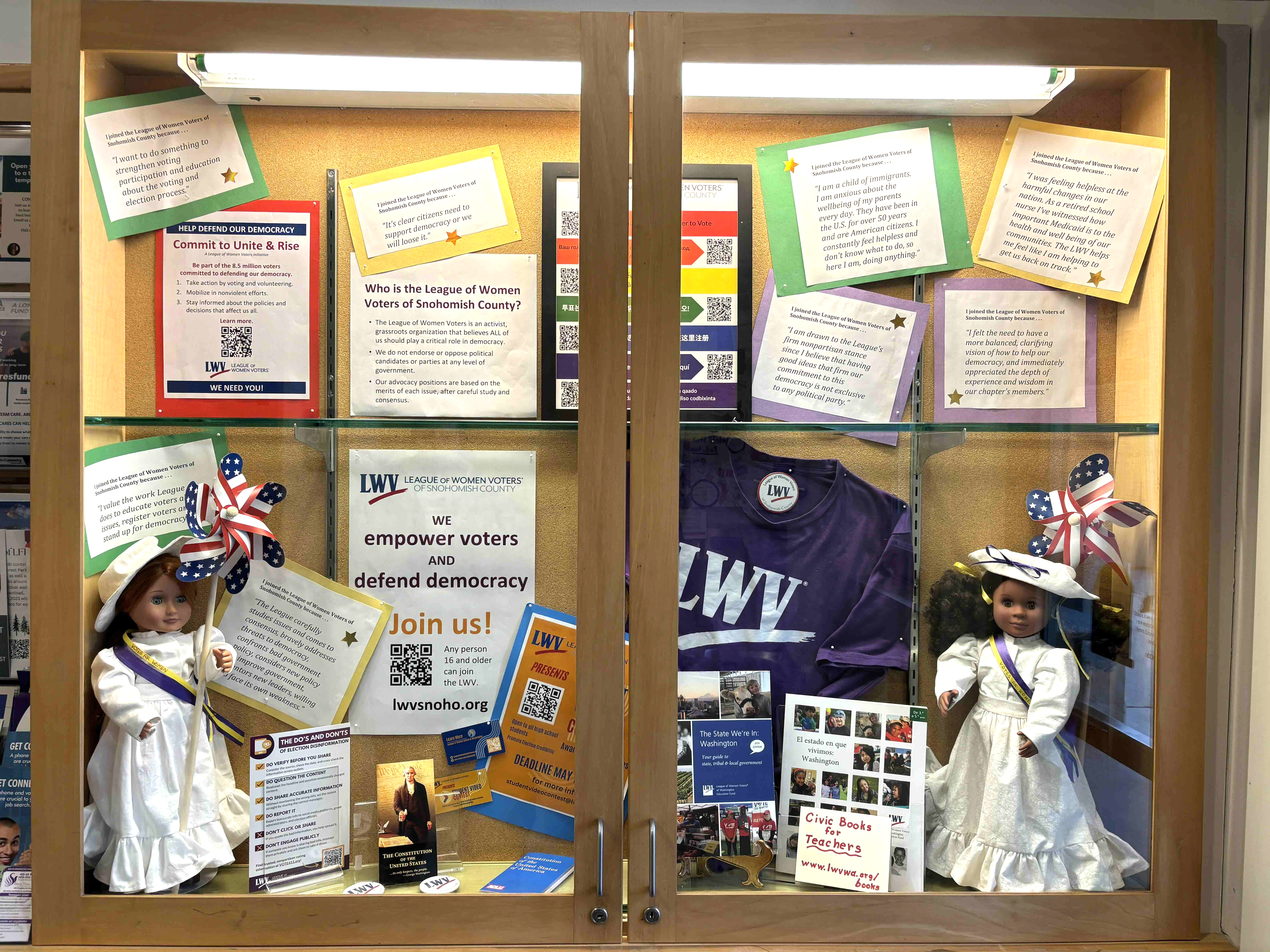 Our League took center stage for the month of November in the display case at the Sno-Isle Library in Brier. We used the prominent space in the lobby to highlight our work, why our members join, and how others can become members.
