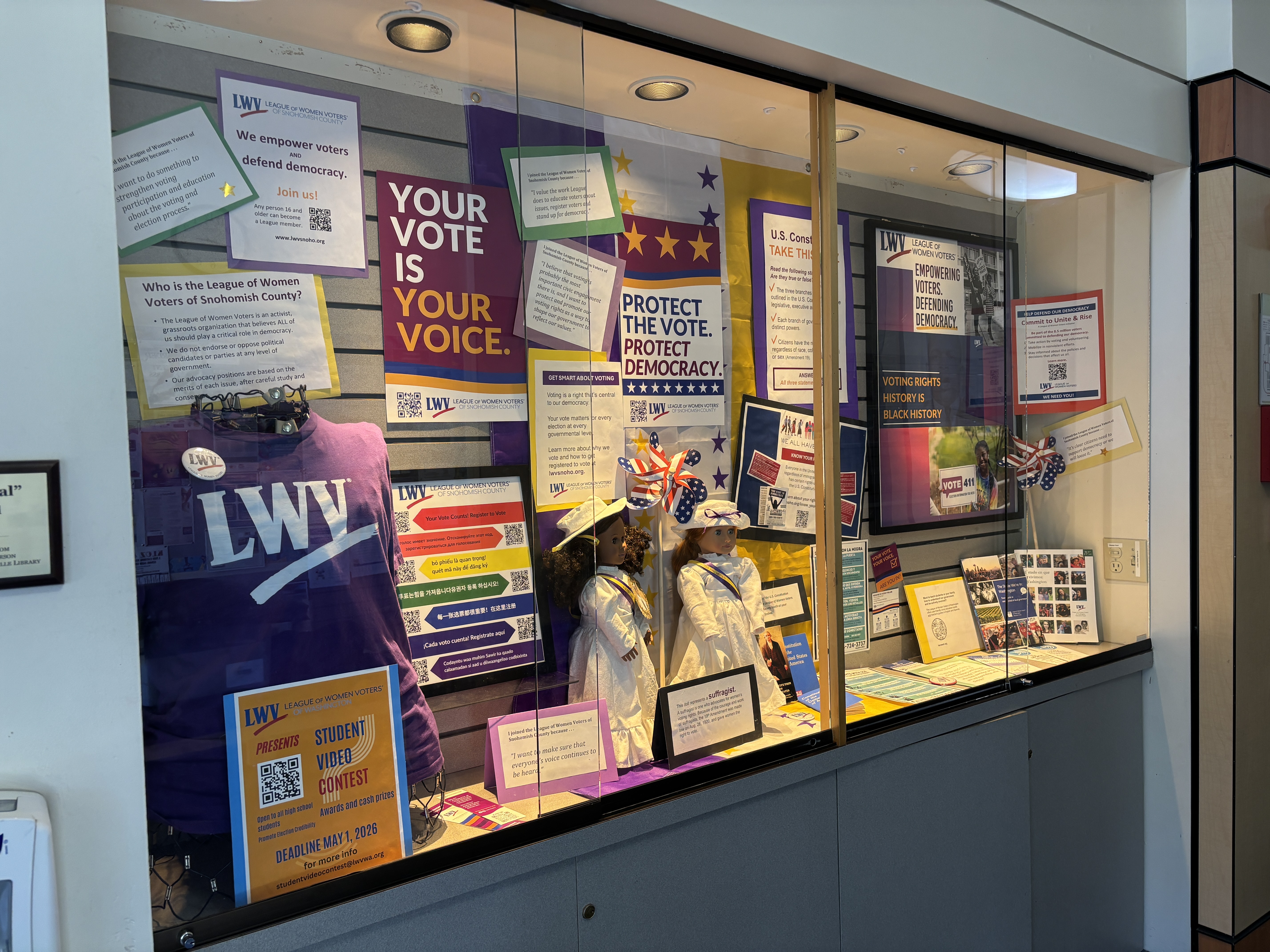 Our League is taking center stage in the display cases at libraries across the county to increase public awareness of the issues impacting our democracy and to share how our League is making a difference. We also invite the public to join us in taking action together.