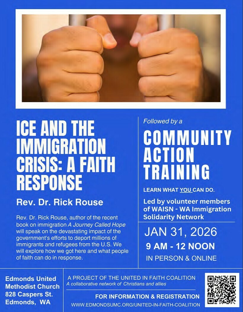 Part One: At Edmonds United Methodist Church. 9-10:00 am - "ICE and the Immigration Crisis: A Faith Response" by Rev. Dr. Rick Rouse Rev. Dr. Rick Rouse, author of the recent book on immigration, A Journey Called Hope, will speak on the horrific impact of the government's efforts to deport millions of immigrants and refugees from the U.S. We will explore how we got here and what people of faith can do in response.